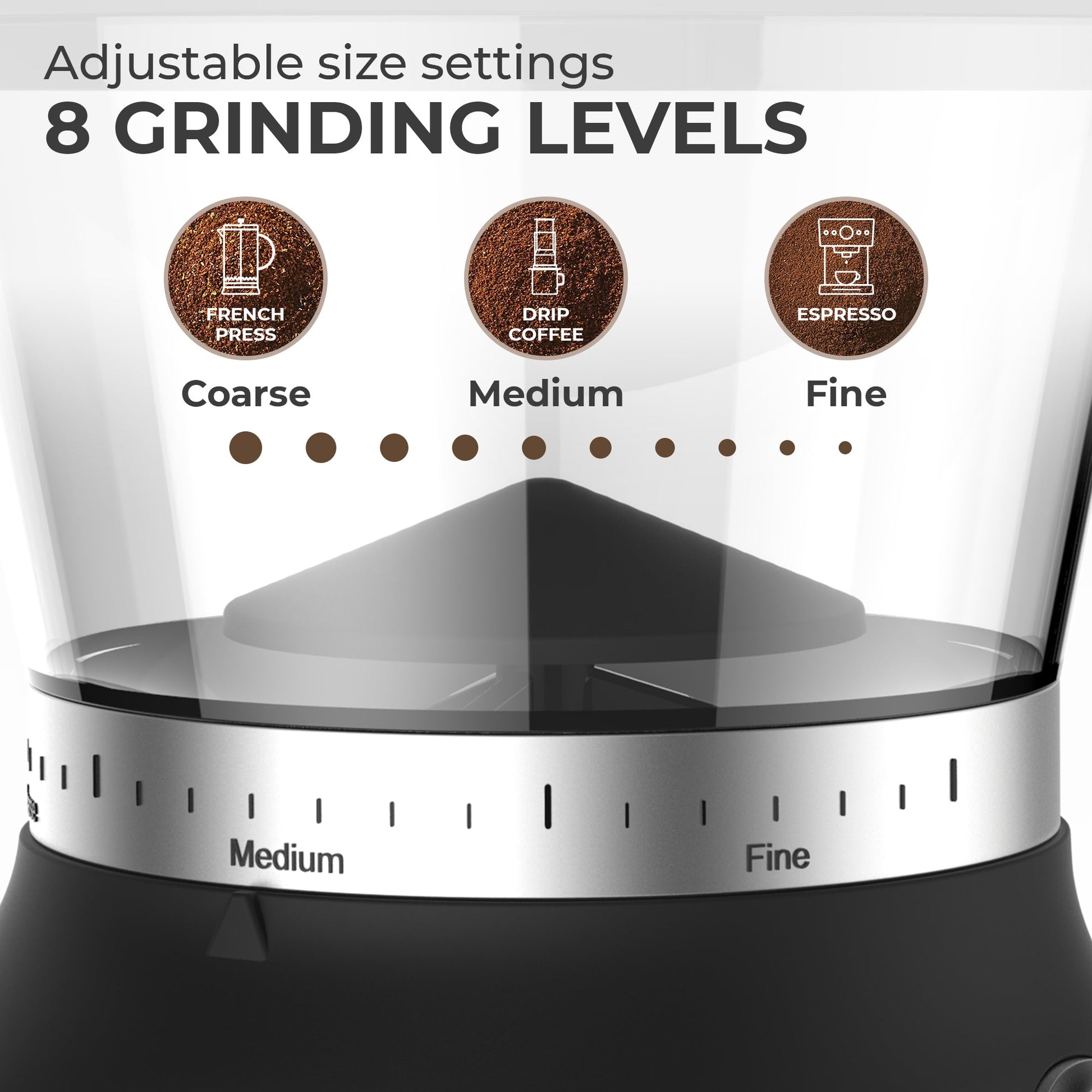 - ADJUSTABLE SETTINGS. This electric coffee grinder allows you to choose from 25 settings according to how fine or coarse you'd like to grind your coffee beans - from French press-coarse to espresso-fine.