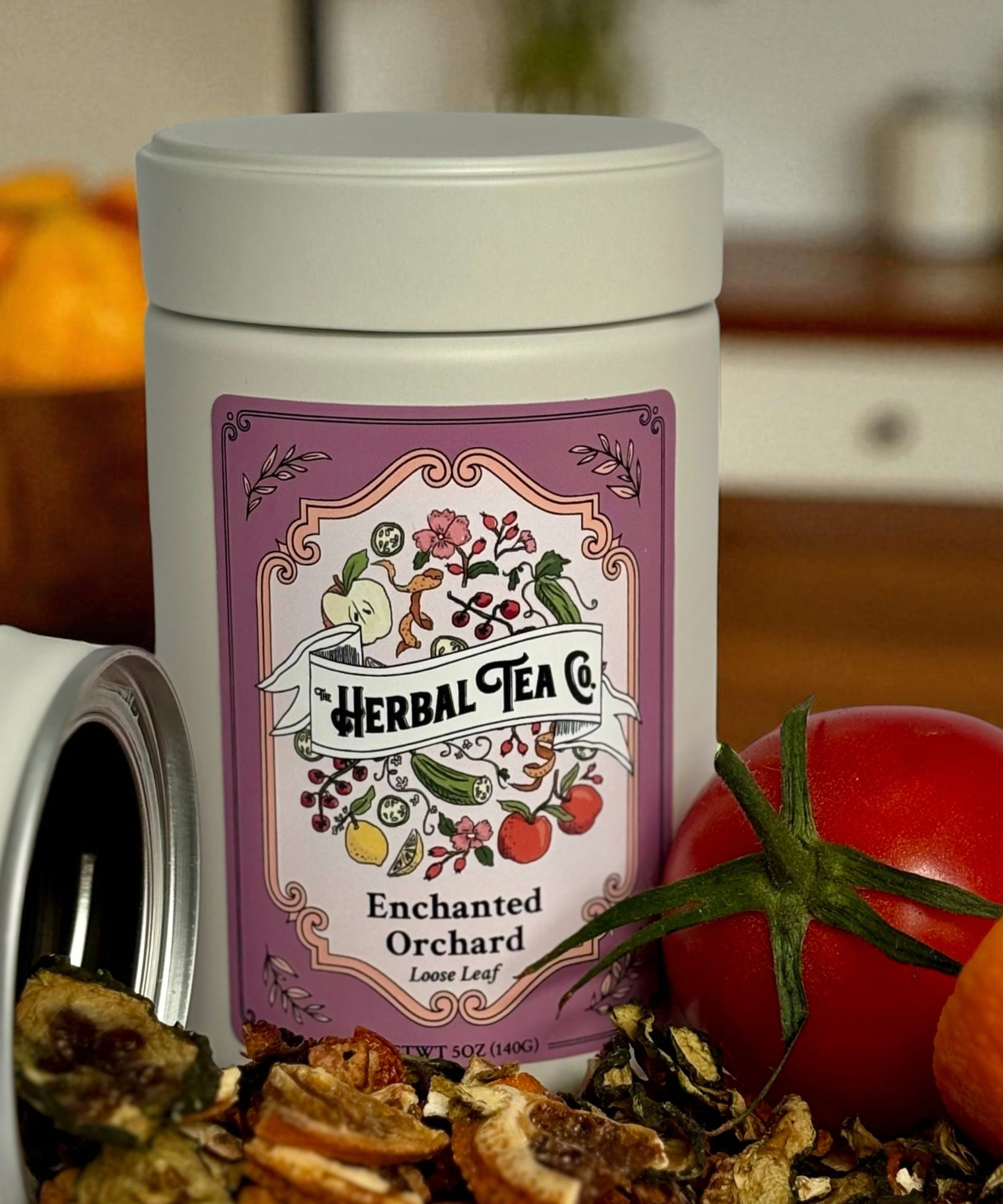 Our Enchanted Orchard is a refreshing stroll through fall’s unexpected bounty—where orchard fruits meet garden intrigue. Crisp apple and tart hibiscus mingle with citrus slices of lemon, lime, and orange, while rosehips add a gentle depth. Savory notes of cucumber and tomato lend a surprising twist, evoking the charm of a harvest table kissed by autumn sunlight.
